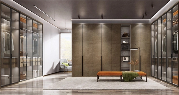 蒂斯系列衣帽间采用仿真岩板呈现的真实火山岩石肌理,搭配米灰皮纹打造开放式柜格,在自然感中点缀出时尚的轻奢,干净利落的黑色线条拉手在一门到顶的设计下,排列出线面的比例,打开柜门就是大气又简约的分类收纳布局,叠放区、悬挂区、抽屉、大件存放区......让每一件心爱的衣服都有属于它的安身之所。