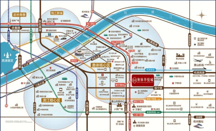 交通:地铁口地铁2号线:振宁路站(直线约300米),区域内还有地铁 6 号线、7 号线、机场快线,是杭州唯一一个4条地铁线汇聚在一起的板块