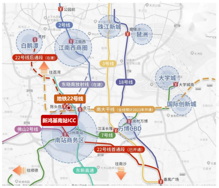 坐享“交通+产业+配套”优势,南站定位[粤港澳大湾区客厅与国家级门户枢纽经济区],以枢纽服务、国际消费和商贸会展为主导产业,带动总部经济、港澳专业服务、科技服务、文旅消费等,覆盖大湾区1小时生活圈,新鸿基致力打造优质的商场、甲及写字楼、五星级酒店等,令南站的人流可以留下来,让南站从中转站变成目的地,成为名副其实湾区C位&广州城市会客厅。