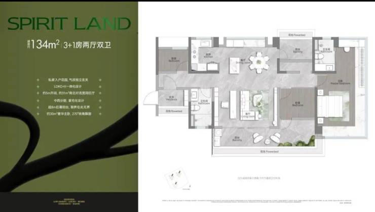 134㎡四房两厅两卫:带入户花园,中西分厨+六人圆桌,稀缺南北通透,8米大阳台、31㎡巨厅、独立衣帽间,堪比豪宅配置。
