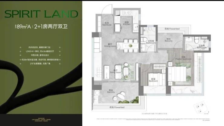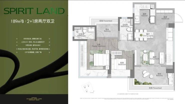 89㎡三房两厅两卫:使用率约115%,约4.8米越级巨厅,中西分厨,约28㎡成长型主套,270°全景飘窗,空间利用率高。