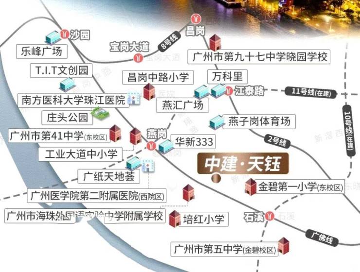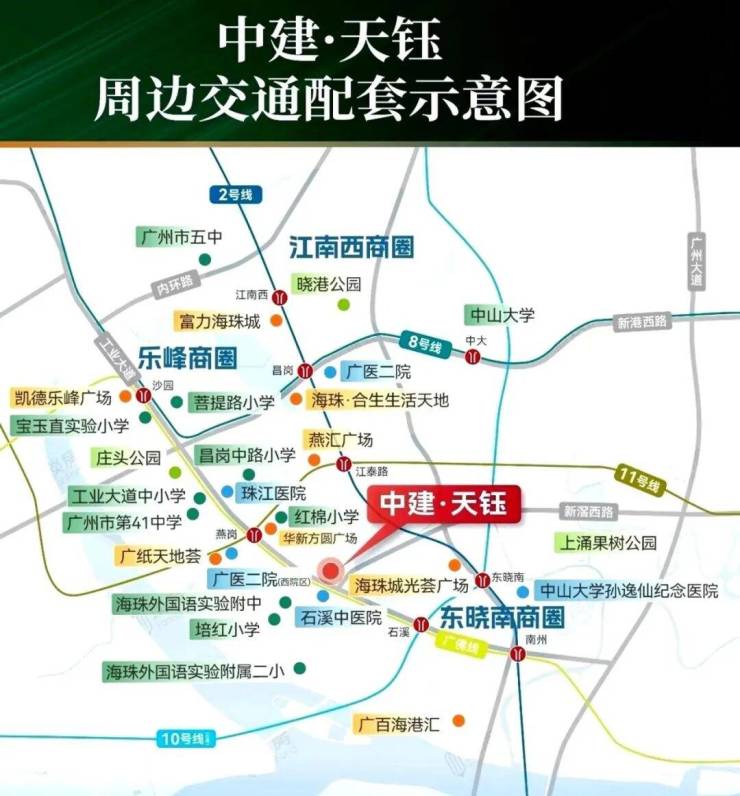 中小学:3公里内有8所省市一级学校,如海珠外国语实验中学附属第二小学、红棉小学等,但学位紧张且存在预警,具体学位归属需以官方公布为准。