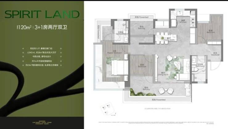 120㎡四房两厅两卫:南北通透大四房,约28㎡南北对流大方厅,中西分厨,约7米大平层级阳台,约23㎡奢阔主卧,私享独立衣帽间。