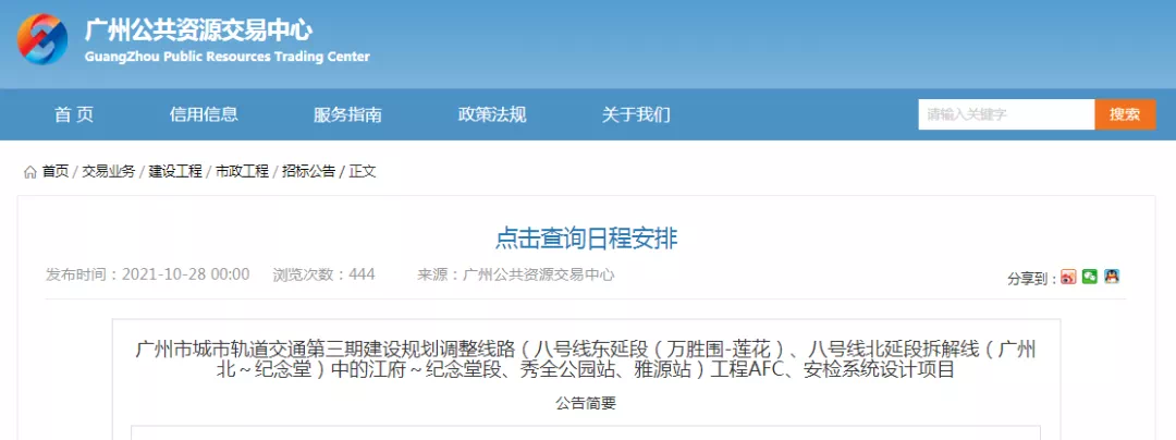 日前,广州公共资源交易中心发布广州市城市轨道交通第三期建设规划调整线路(八号线东延段(万胜围-莲花)、八号线北延段拆解线(广州北~纪念堂)中的江府~纪念堂段、秀全公园站、雅源站)工程AFC、安检系统设计项目招标公告。