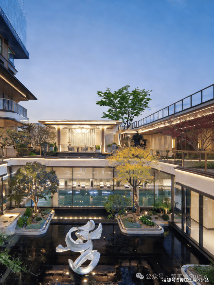 下沉庭院中水面如皱镜,倒映檐角、疏枝与银浪雕塑。水静默,将天光晕染成墨,风过处,涟漪轻触树影摇曳,是现代形意与传统水榭的静默对话。园中“空”境,皆浸于此汪柔水,裹挟江岸清润。精心构筑的园林,内部植满百年古木,营造出宛如现代的古典雅境。无论从哪个角度欣赏,都能沉浸于“诗中有画,画中有诗”的意境之中。
