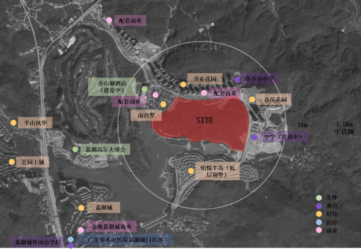 项目背倚3万亩的南香山,面朝约1700亩的荔湖,坐享山水资源的同时,周边配套齐全,教育、商业、医疗等资源丰富,为居民提供便捷的生活服务。