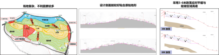 竖向设计(地形利用与改造专项设计)上,我们创新性地采用了竖向先行策略,通过高挖、低填、预留放坡空间、合理分台等方法,巧妙地处理了高差问题,不仅节省了投资成本,并使得每一户都能享受到由高差带来的独特景观和景观体验。户型与地势匹配,道路坡度采用两级结构,划分为入户道路(坡度<3%)与爬坡道路(坡度7%-8%),入户路尽量平缓,保持归家和庭院舒适度。