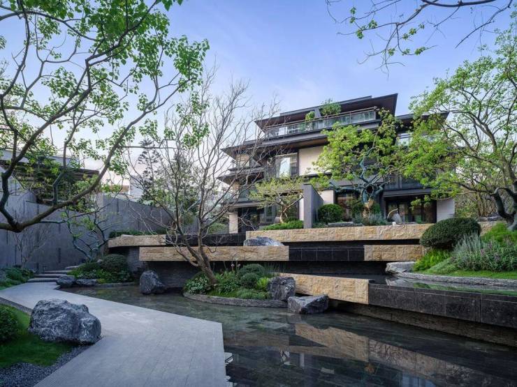 规划师巧妙地将山水意趣融入社区布局,每个角落都充满自然的乐章。鱼骨状的道路与组团布局,结合了礼序与自然,让每一次归家,都是一场仪式感的体验;前庭后院的设计,既保留了私享空间,又让天与地的界限变得模糊;宋风雅韵的建筑风格,简约而不失精致,疏朗而不失雅致,天然而成。
