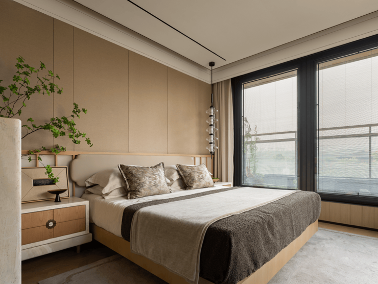 主卧室以白、灰、亚麻、自然绿等淡色为主,较之公共区域更添几分清新自然。