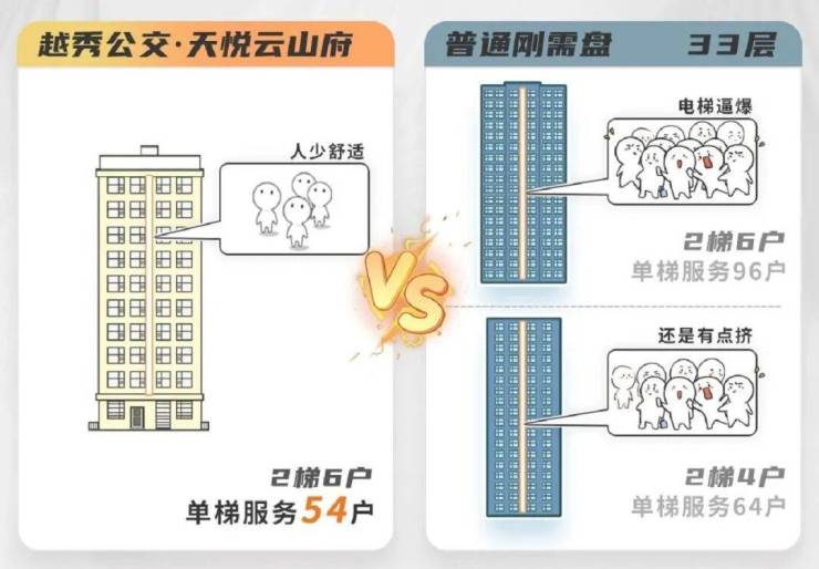 目前在售的是19层/26层小洋房,户数少,私密强;虽然是2梯6户设计,但比周边项目普通高层对比单梯的平均服务户数少了近一半。