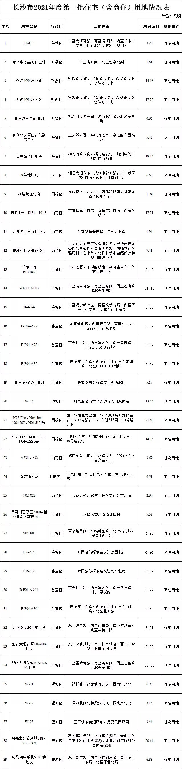 长沙发布排名前列批集中供地清单 供地面积约89公顷