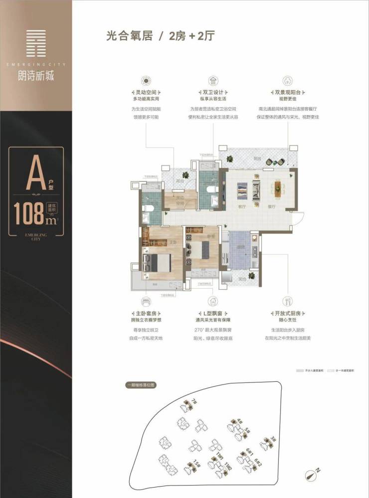⑥建面约108㎡三房两厅两卫,南北通透,阔景大阳台,动静分区,全优户型。