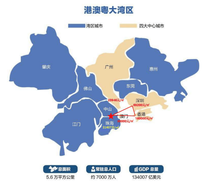 地处粤港澳大湾区几何中心,珠海、广州、深圳、香港、澳门环绕。1分钟到珠海香洲,5分钟抵香洲中心,房价差约1/4。