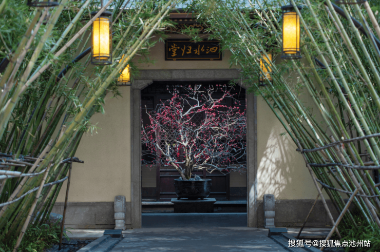 迈入门庭,在翰林九境府内,藏着一座惊艳的中式园林,影壁回廊通过层层窗棂,营造视觉空间的层次感,穿行而过,只见竹林夹道接引泗水归堂,以石门为框,门内红梅为景,拉开一幅充满禅意的写实画卷。