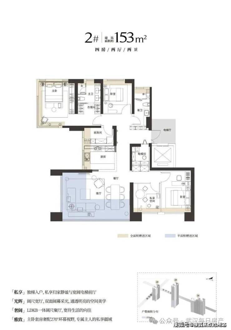 其中,1号楼和2号楼,2-15F都是153㎡户型;16F及以上,西边户是188㎡户型,东边户是153㎡户型。