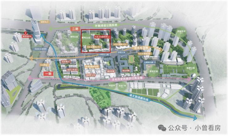 • 小区规划好:总建面约114万㎡,规划有公园绿地、老年康乐区和儿童活动区等,是全龄化社区,园林景观优美,还有四条景观连廊串联水脉、公园、商业、文脉等。