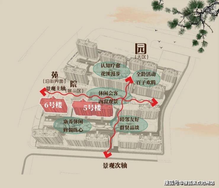 宋韵美学设计:以宋式园林为蓝本,打造“一环两轴五景”景观体系,融合“门堂、游园、雅集”三进归家礼序,重现宋人雅致生活意境。