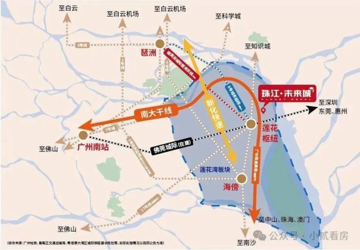未来,不仅可以实现3站到琶洲CBD、万博CBD,4站到南站(佛莞城轨、穗莞深城轨琶洲支线),触角延伸到佛山、东莞和深圳,将莲花湾引领至广州主城区乃至湾区各地。