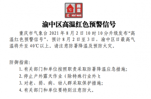 抓着暑假的尾巴,重庆的火热夏天来了。近几日40度的高温,气象台升级发布“高温红色预警信号”,让市民注意防暑。