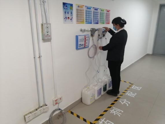 除了消杀频次,百思得还继续提升智能化水平,引进自动化程度较高、可自动按需求配比清洁剂的消杀设备,可按不同区域使用“洁净区”“轻度污染区”“污染区”“重度污染区”不同级别的清洁药剂,减少人工作业,降低卫生风险。