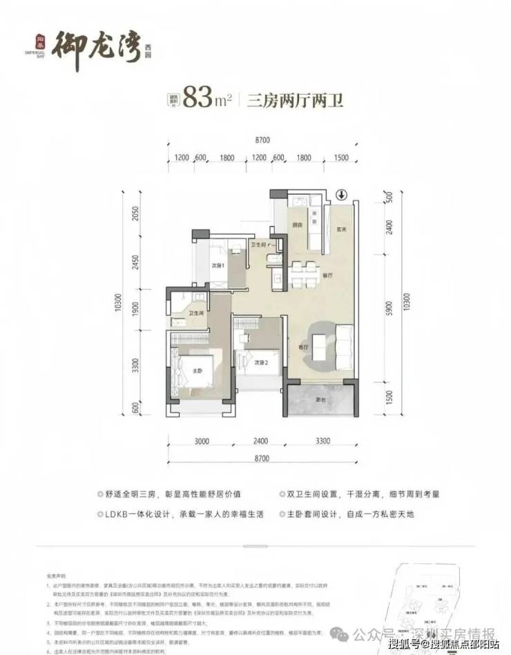 83㎡3房2卫,分布在2栋2单元03/04户型,设计的是竖厅格局,客厅开间3.3米,LDKB一体化设计,三开间朝南,U型厨房,公卫三段式分离设计,得房率约79.25%(不含赠送),东南或西南朝向,加上赠送得房率约89%