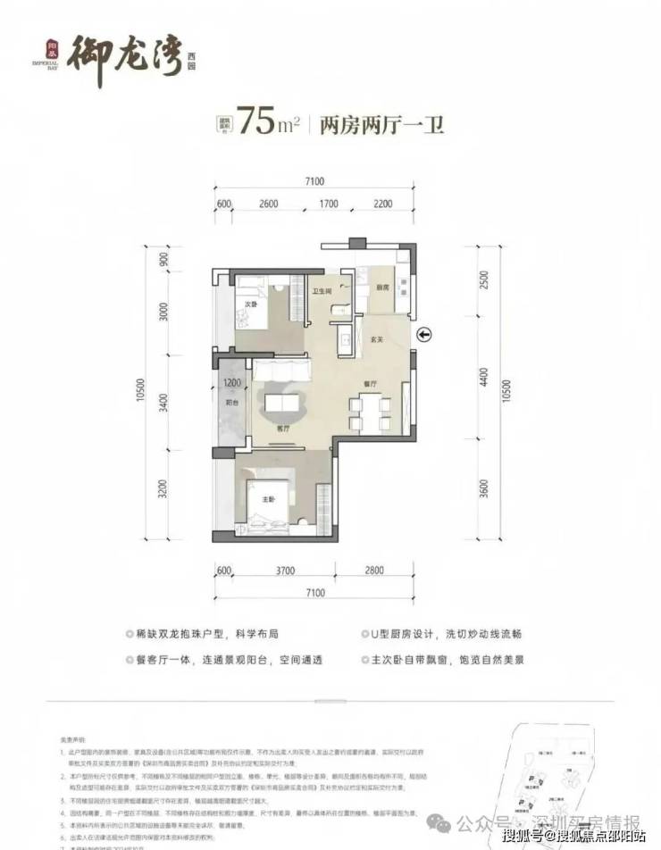 75㎡2房1卫,分布在1栋3/4单元03/06户型,设计的是竖厅稀缺的双龙抱珠格局,客厅开间3.4米,U型厨房,卫生间三段式分离设计,得房率约73.26%(不含赠送),东南或西北朝向,加上赠送得房率约80%