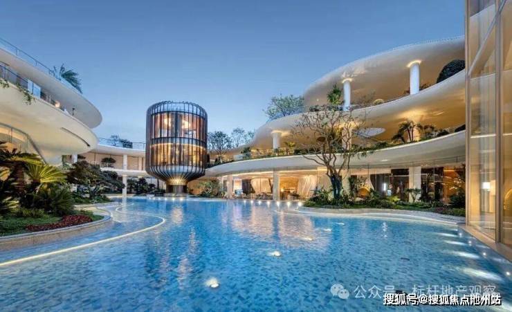 凭借约16米高差,营造穿行山水的沉浸式体验。以“两轴三庭”布局,园区中间水系面积超2500方,俯拾可见的瀑布、泳池,热带植物丛簇,犹如顶奢度假酒店。
