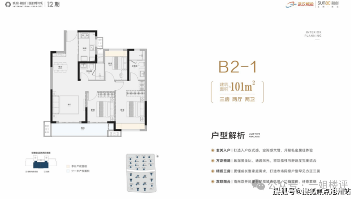 建面约102平 三房两厅两卫:常规的连廊中间套户型。