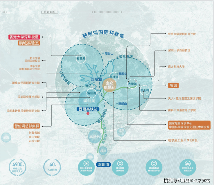 执掌湾区科创核心,定鼎城市未来价值高地。集智纳贤、创新不断。规划面积69.8平方公里的西丽湖国际科教城正显现“创新加速度”,从2002年开始,深圳在其周边布局了大学城,清华、北大、南科大等高校,以及鹏城实验室等科研机构相继入驻。目前,这里已集聚35名全职院士、多所高校单位超8.6万名在校师生,入驻国家、省、市级创新载体超500家,日渐形成粤港澳大湾区发展的“知识引擎”。