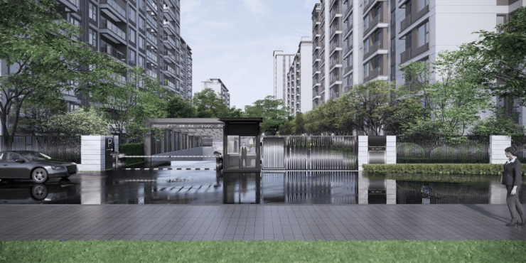 社区大门完全区分人行、车行入口,人行入口采用石材与玻璃搭配设计,大气恢弘!门厅景观水院精致高级,入户仪式感满满!