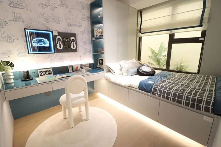 主卧套房设计,隐私性较好,飘窗设计更有效延申室内空间,也可以作为休闲区域使用,收纳空间设计的也比较充足,切实考虑年轻人买买买的购物习惯。