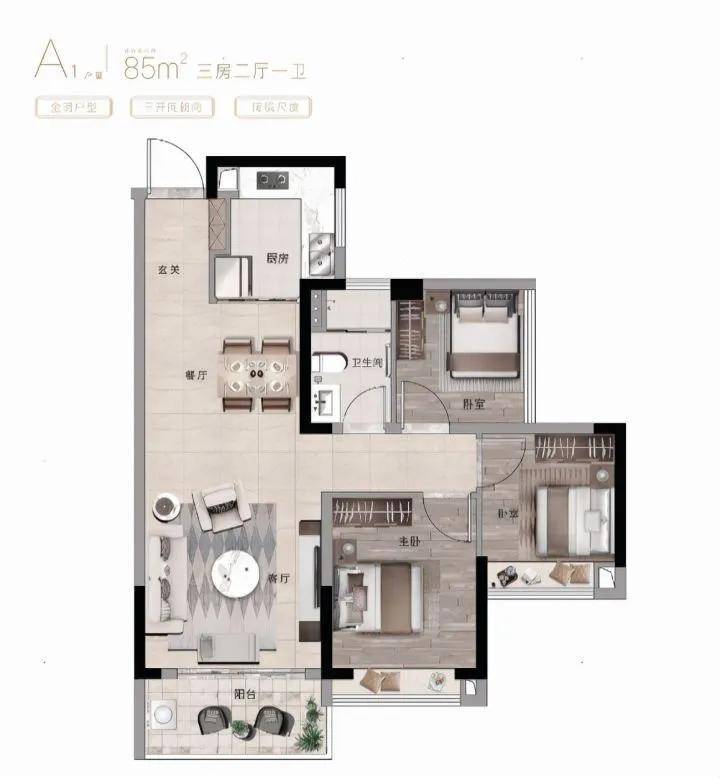 ✅ A户型 85㎡3房2厅1卫