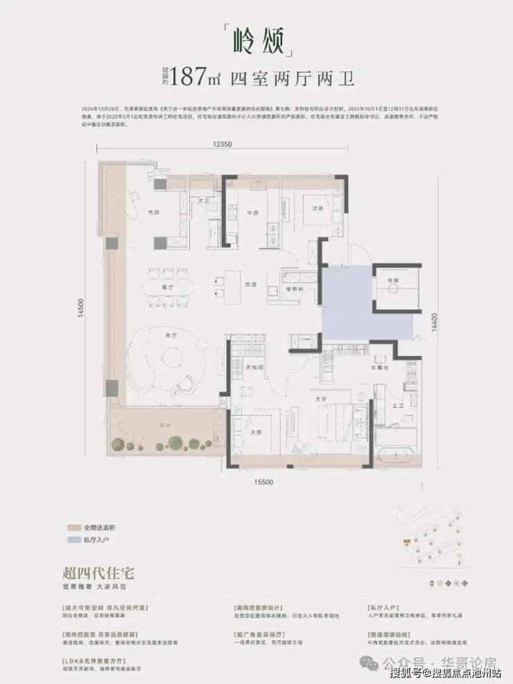 187㎡大4房2厅2卫,该户型亮点是做到了3面采光,70多㎡的大客厅以及面积阔绰的主卧套房。