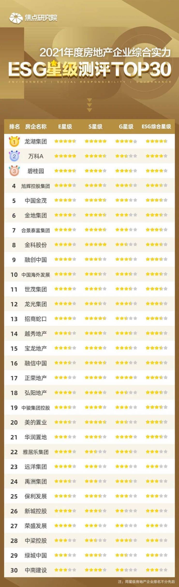本测评为针对房地产企业2021年度ESG管理中的成果进行的综合星级测评。焦点研究院收集并整理了房地产企业官方网站信息、房地产企业公告及住房及城乡建设管理部门等政府部门数据,对环境资源维度(E)、社会责任维度(S)及公司治理维度(G)分别进行深入分析,最终形成2021年度房地产企业综合实力ESG星级测评TOP30榜单及三大维度榜单: