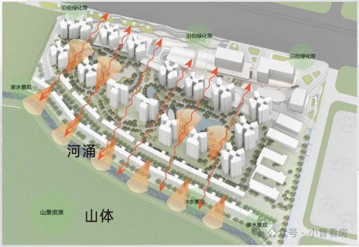 项目的楼栋设计十分注重南向河景+山景的搭配,从而提升项目的景观价值。