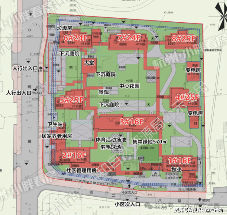公区规划有下沉式庭院、地下会所、全域风雨连廊、中心花园等,主出入口位于西侧永晖路,距离地铁口更近的次出入口位于小区南侧。