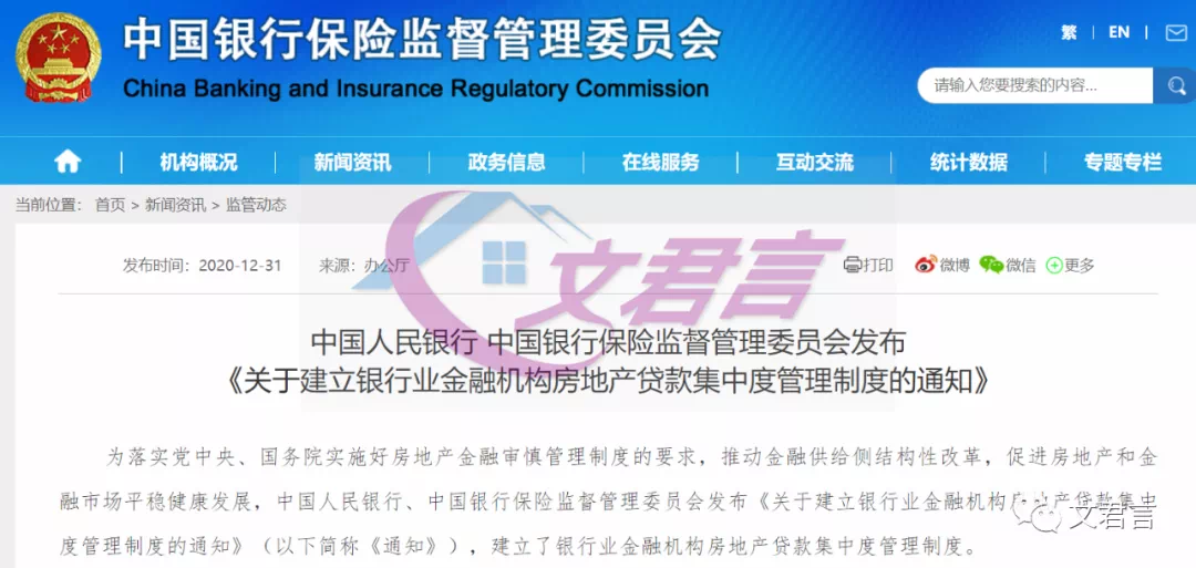 今日(2020年12月31日),中国人民银行、中国银行保险监督管理委员会发布《关于建立银行业金融机构房地产贷款集中度管理制度的通知》,自2021年1月1日起实施。