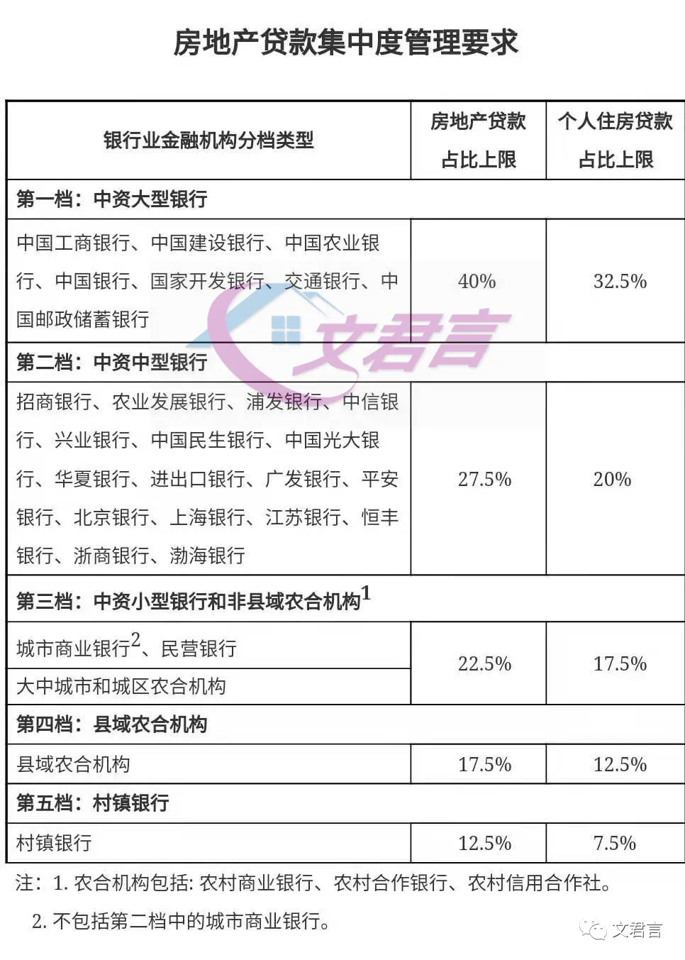 其中,工商银行、建设银行、农业银行、中国银行、国家开发银行、交通银行、中国邮储银行:房地产贷款占比上限40%,个人住房贷款上限32.5%。