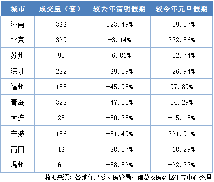 表:清明假期重点城市成交、同比以及较元旦假期相比情况