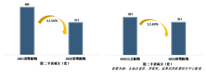 数据显示,2022年清明小长假(4月3日-4月5日)期间,重点10城新房成交1823套,较去年同期的3658套下跌50.16%,但较今年元旦假期重点10城成交的1699套有所上涨,涨幅为7.3%;重点5城清明假期二手房共成交311套,与去年同期相比下跌32.54%,较今年元旦假期下跌12.89%。