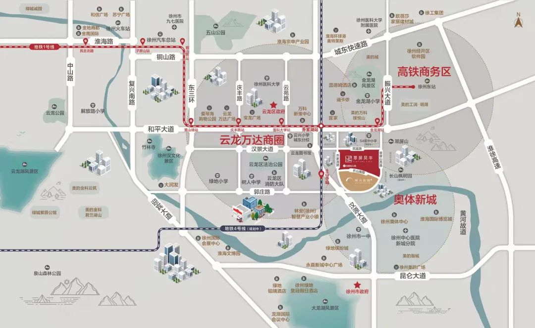 项目位于东区翠屏山,汉源大道东侧、和平路南侧,通过汉源大道,可以一路进入新城区。通过和平路可以到达云龙公园、云龙万达、云龙科技园等,约1公里处是迪卡侬和宜家,约1.1公里处是刚刚开业的新淮中心商业体。