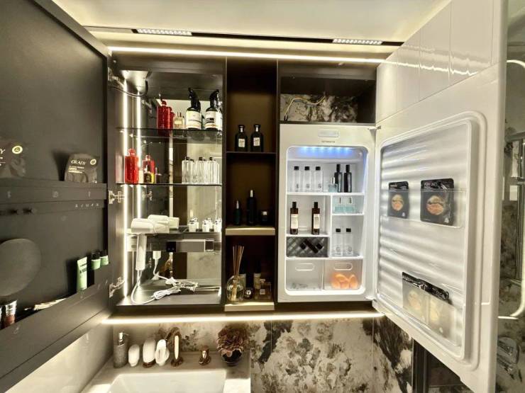 镜柜收纳空间也做了升级!不仅设计了方便拿取常用化妆品的壁龛,还配置了美妆冰箱,可谓是超级人性化考量!