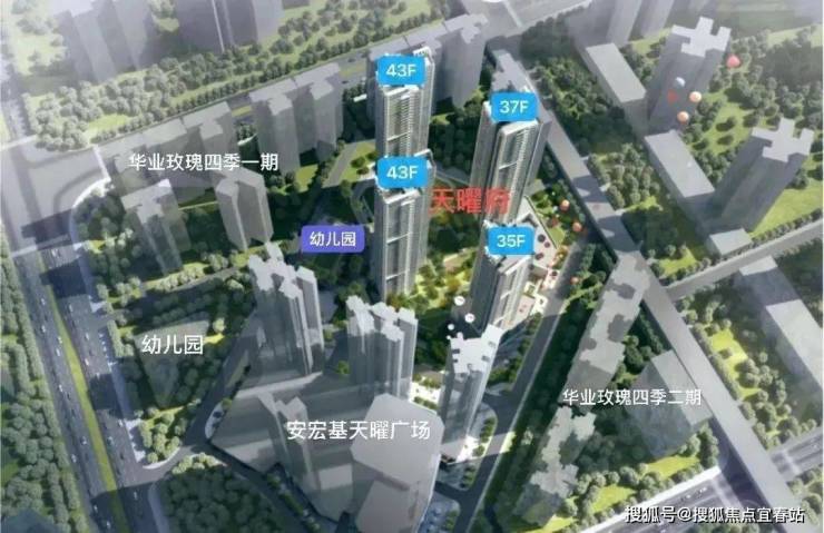 「安宏基天曜府」采用围合式布局,由四栋超高层住宅、商业裙楼及幼儿园组成,楼栋间距较宽,最宽有80米。1栋1单元住宅35F,1栋2单元,3单元住宅43F,每层3梯5户。1栋4单元住宅37F,每层3梯6户(回迁房都在此单元)。2栋为幼儿园。