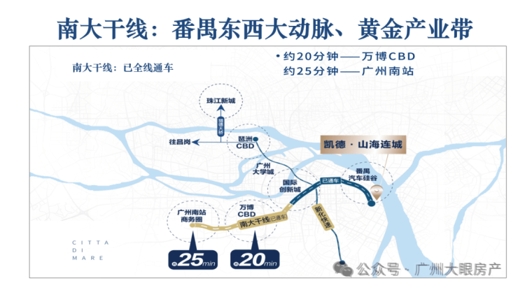好处是项目自驾还算方便,目前南大干线已经全线开通,去往南站、万博、大学城、创新湾等地都很快,比如去往琶洲,仅仅26分钟的车程时间