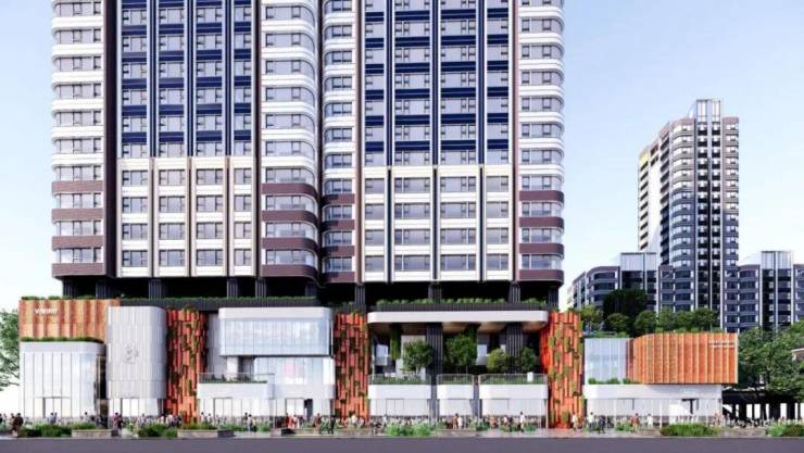 外立面方面,项目整体将打造为新海派建筑地标,设计有弧线阳台、45度玻璃、双层塔冠等,设计灵感来源于蔓楼兰;立面色调方面,将采用珐琅彩色调,具体或为珍珠蓝铝板+红色纹理+金色线条,具体材料及配色还在最终确认。