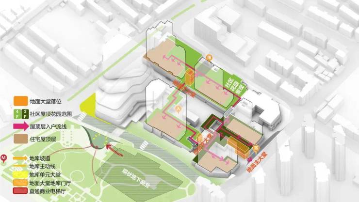 归家动线:建立在混合业态的基础上,住宅用户归家,可以通过专属独立大堂的艺术阶梯或者周边电梯,垂直抵达三层/四层归家花园道,实现情绪归家。在花园内可以通过风雨连廊实现无风雨归家。