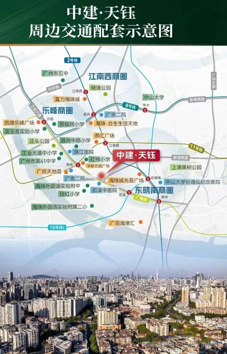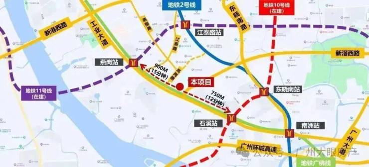 中建天钰坐拥双地铁,位于广佛线燕岗和石溪两个地铁站之间,步行距离分别是750米和900米,目前开通的是广佛线,燕岗站同时是大环线11号线的站点,去海珠琶洲、天河、越秀等核心板块都很方便;