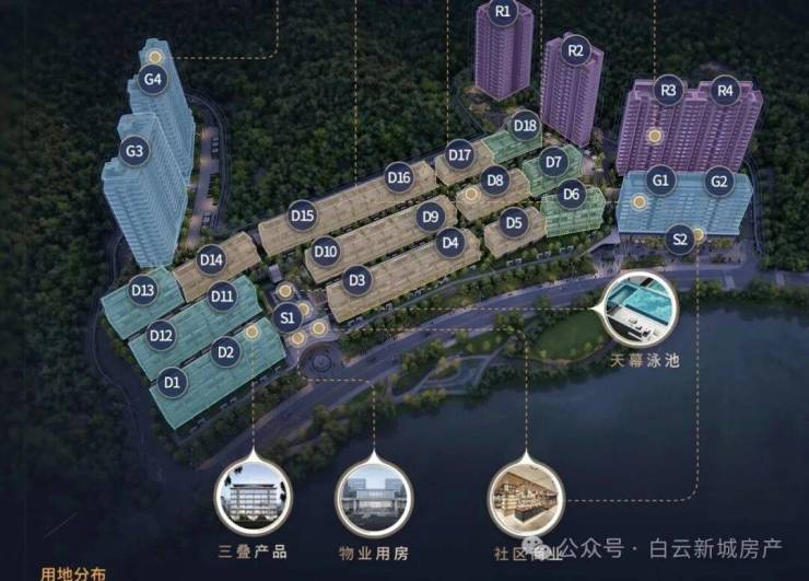 叠墅:位于临湖区,由18栋4-6层的叠墅组成,规划了188套,每栋楼为一梯一户,私密性较强。这些叠墅不仅有较为宽敞的室内空间,还可以享受湖景与山景,周围绿化丰富,提升了居住的舒适度和美观性。