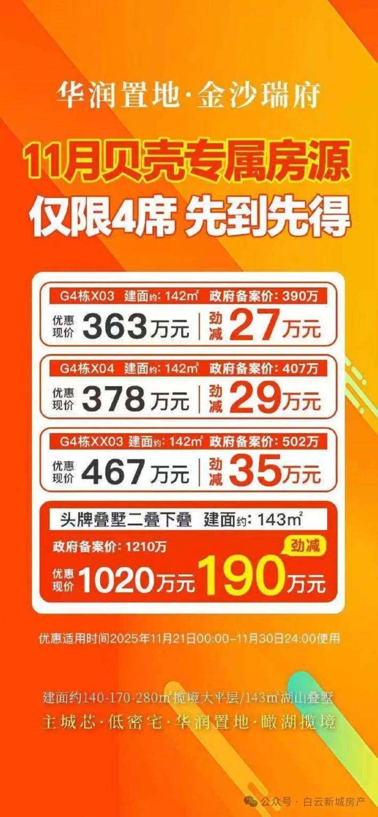 在售户型:143㎡住宅、143㎡二、三叠湖山院墅(上叠实用约400㎡,中叠实用约380㎡,下叠约320㎡)