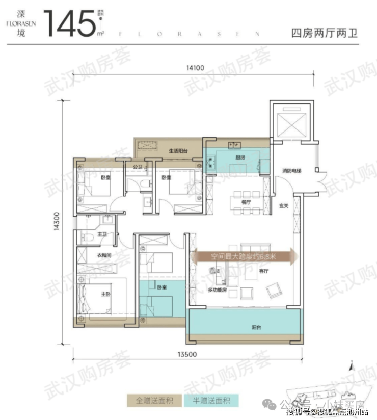 ④户型设计合理,100平配置双阳台设计,125平实现独梯入户,得房率最高可达约105%
